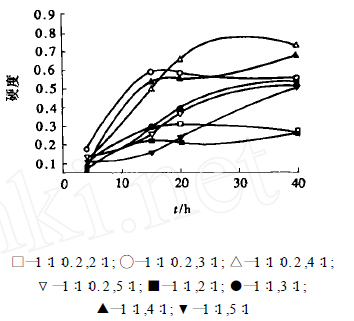 環氧樹脂型涂料的性能,除了取決于環氧樹脂的類型和固化劑的種類以外,另一個很重要的因素就是環氧樹脂與固化劑的配比。無論固化劑的量多與少,都會給漆膜造成不同程度的缺陷,因此,環氧樹脂與固化劑的配比是設計涂料配方中很重要的一環。從圖1 和圖2 可以看出,環氧樹脂與固化劑的質量比為4∶1 時,漆膜固化效果最佳。表3、表4(圖例中“, ,”前后分別表示固化劑的組成配比和固化時間) 更明確地說明了這一點。